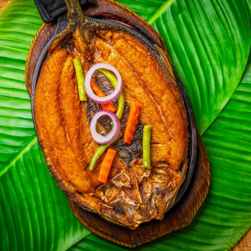 Fried marinated milkfish, topped with onion, carrots, & beans.